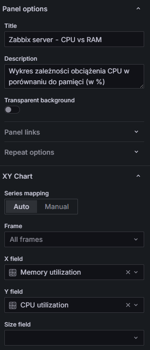 - Panel options → Title – tytuł np. „Zabbix server – CPU vs RAM”,