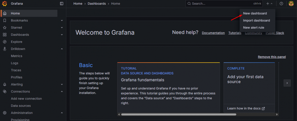 Na początek dodajemy nowy dashboard klikając w “+” – “New dashboard” na rozwijanym paneli u góry strony: