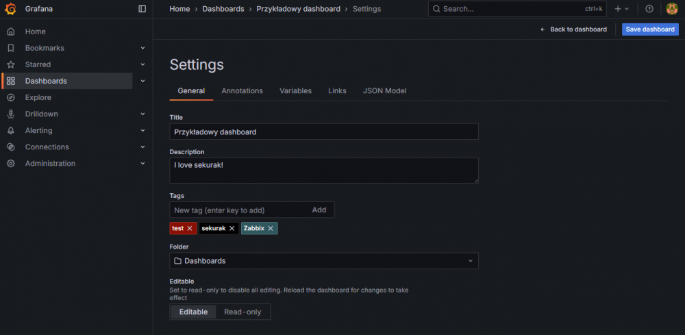 Na początek dobrze jest kliknąć „Settings” (prawy górny róg). W sekcji „General” możemy zmienić nazwę dashboardu, dodać opis i tagi (co później ułatwi wyszukiwanie na liście).
