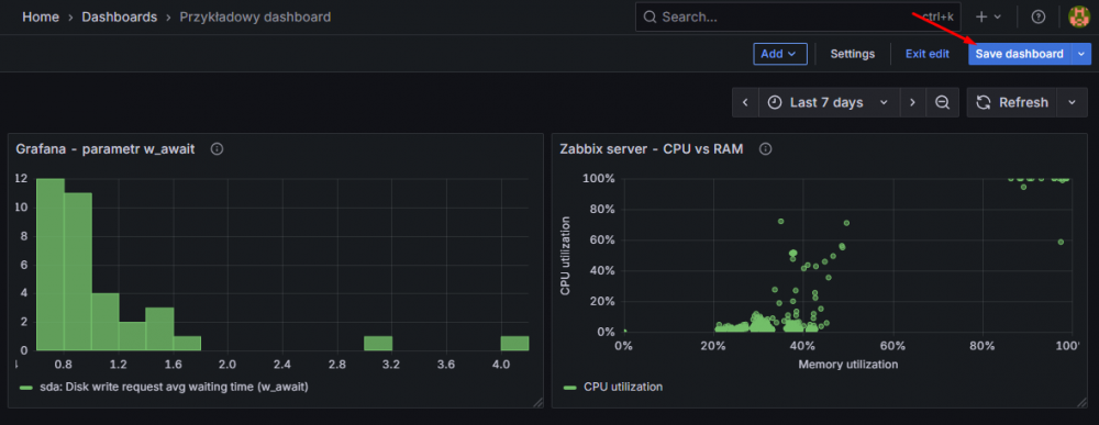 Możemy wyjść z trybu edycji panelu. Po ewentualnym przestawieniu nowo utworzonych paneli dashboard powinien wyglądać mniej więcej tak, jak na poniższym przykładzie. Pamiętaj, aby zapisać zmiany przyciskiem „Save dashboard”!