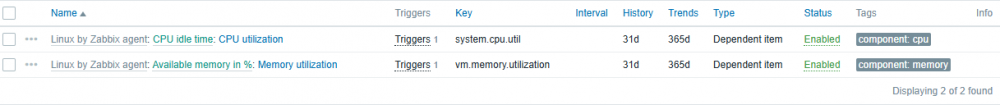 Dla zobrazowania, poniżej pokazano listę pozycji CPU utilization i Memory utilization w Zabbix, które będziemy wykorzystywać: