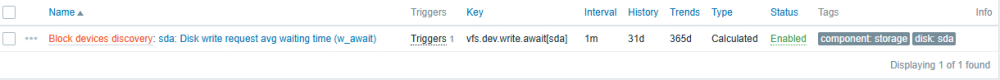 - Item – wpisujemy nazwę naszej pozycji (lub wybieramy z listy) – “sda: Disk write request avg waiting time (w_await)”