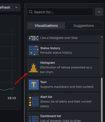 Udało nam się wyświetlić pierwszy wykres w grafanie. No właśnie… a mieliśmy unikać prostych przykładów i pokazać coś ciekawszego! Skupmy się więc teraz na prawej części ekranu, gdzie znajduje się okienko „Visualization”. Domyślnie wybrane jest „Time series” (czyli zwykły wykres liniowy). Zmieńmy to na „Histogram”: