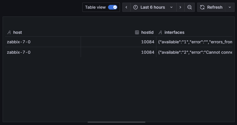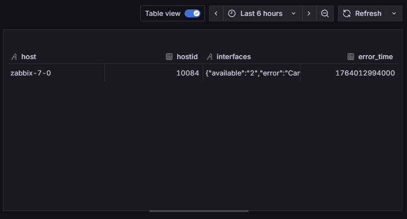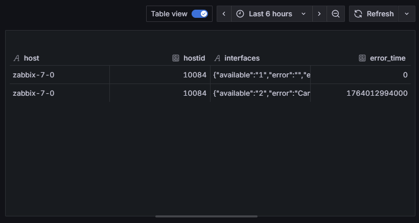 Pole errors_from zwracane przez Zabbix w obiekcie interfejsu zawiera znacznik czasu w sekundach. Grafana operuje na timestampach w milisekundach, dlatego konieczne jest przeliczenie tej wartości.Wykorzystujemy do tego funkcję mul, mnożąc wartość przez 1000. Polecenie extend tworzy nowe pole error_time, zawierające już czas w poprawnym formacie. Przykładowy wynik po tym kroku (dla czytelności pominięto część obiektu interfaces) wygląda następująco: