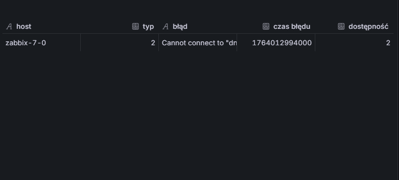 Jeżeli wrócimy teraz do interfejsu Zabbixa i sprawdzimy hosta zabbix-7-0, możemy potwierdzić poprawność danych. Zobaczymy, że dla interfejsów ze statusem Nieznany nie występuje żaden komunikat błędu. Dodatkowo udało nam się pozyskać informację, której nie da się odczytać bezpośrednio z interfejsu Zabbixa — czas niedostępności interfejsu.
