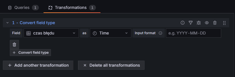 • W sekcji Transformations dodajmy transformację o nazwie Convert field type. W jej konfiguracji, w polu Field, wybierzmy kolumnę czas błędu – chcemy, by Grafana traktowała tą kolumnę jako czas, dlatego w polu as wybierzmy Time. Od tego momentu kolumna powinna wyświetlać datę i godzinę zamiast surowego znacznika czasu (timestamp).