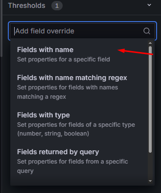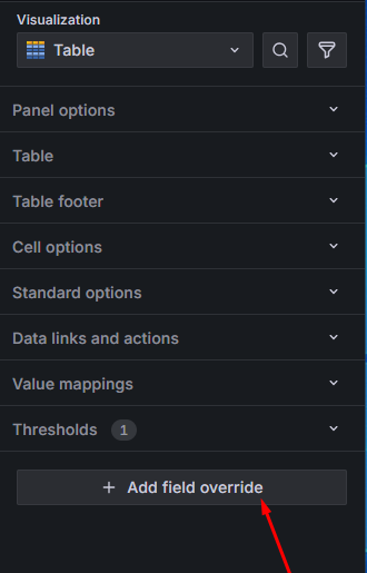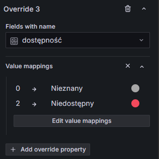 • Chcemy, aby dane były bardziej czytelne dla użytkownika, który nie jest zaznajomiony z API Zabbixa. W tym celu wykorzystamy mechanizm nadpisywania ustawień pól (ang. Field overrides). W tym celu, w sekcji po prawej stronie zjedźmy na sam dół aż znajdziemy przycisk + Add field override: