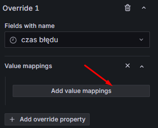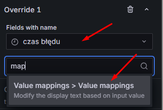 Wskazujemy teraz na pole czas błędu. Teraz dodajemy nowe nadpisanie – wybieramy mapowanie wartości (ang. Value mappings) dla tej konkretnej kolumny: