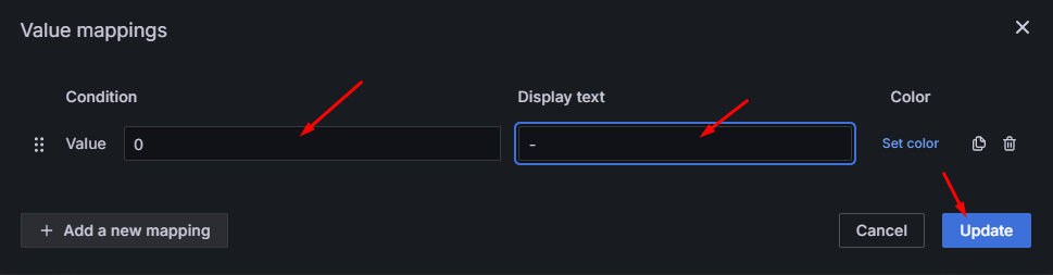 W nowym okienku wpisujemy mapowanie zera (0) na myślnik (-). Dzięki temu Grafana nie będzie wyświetlać daty 01-01-1970 (czyli daty odpowiadającej timestampowi równemu 0), a zamiast tego pokaże po prostu myślnik. Jest to znacznie czytelniejsze i od razu sygnalizuje brak wartości. Na koniec pamiętajmy o kliknięciu Update.