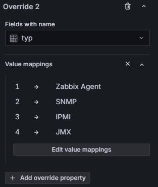 Bazując na powyższym przykładzie, dodajmy kolejne nadpisanie ustawień — tym razem dla kolumny typ, z odpowiednim mapowaniem wartości. Przypominamy, że są to wartości zwracane bezpośrednio z API Zabbixa dla obiektu interfejsu hosta.