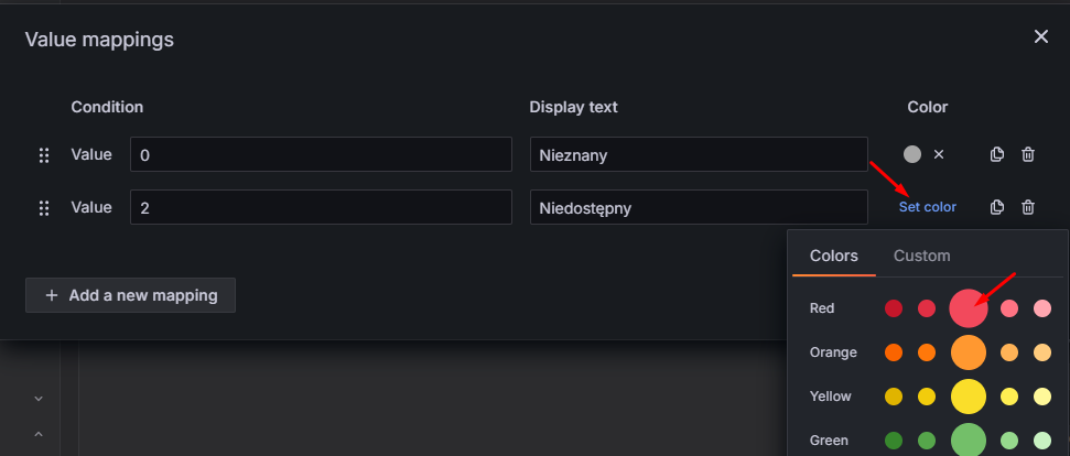 Kolory możemy ustawić w okienku Value mappings klikając przy odpowiednim mapowaniu na Set color i wybierając interesujący nas kolor dla odpowiedniej wartości: