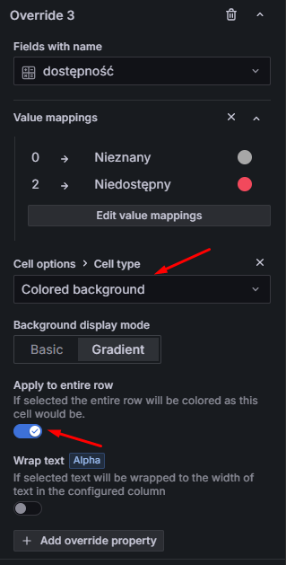 Dzięki temu ustawimy kolorowanie komórek na podstawie wartości tego pola. Z listy wybieramy opcję Colored background, a następnie zaznaczamy Apply to entire row. Sprawi to, że cały wiersz tabeli będzie podświetlany odpowiednim kolorem w zależności od statusu interfejsu. Całość nadpisania ustawień dla tego pola powinna wyglądać następująco: