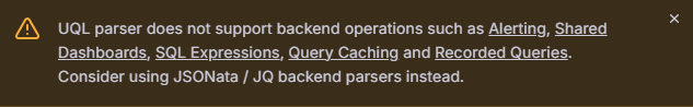 UQL (Unstructured Query Language) to prosty, przejrzysty i bardzo elastyczny język do pracy z danymi. UQL jest wykonywany bezpośrednio w przeglądarce klienta, co oznacza, że backend nie jest obciążany (może to być przydatne, gdy np. posiadasz niewielką instancję Grafany z minimalnymi zasobami, a potrzebujesz przetworzyć dużą ilość danych z API). Ceną za to jest jednak brak możliwości użycia niektórych mechanizmów Grafany na takim zestawie danych, takich jak alertowanie czy buforowanie odpowiedzi (niedostępne w Grafana OSS). Grafana zresztą będzie nam to regularnie przypominać podczas konfiguracji zapytania:
