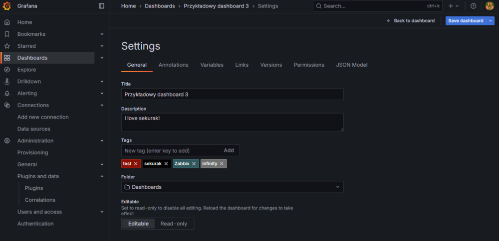 Rysunek 3. Ustawienia nowego dashboardu “Przykładowy dashboard 3”