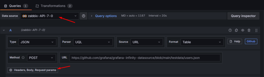 Tworzymy pierwszy panel. W sekcji Queries (na dole strony) ustawiamy źródło danych na wcześniej skonfigurowane zabbix-API-7-0 i konfigurujemy zapytanie w następujący sposób: