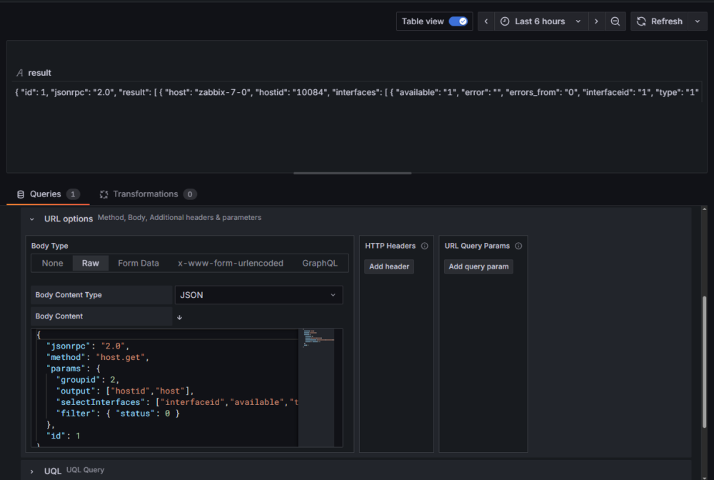 To jest moment, w którym UQL zaczyna mieć realne zastosowanie. Z API otrzymujemy komplet danych, ale w formie, która nie nadaje się jeszcze bezpośrednio do wizualizacji. Zamiast rozbudowywać zapytanie po stronie Zabbixa albo przenosić całą logikę filtrowania i obróbki do transformacji w panelu Grafany, wykorzystamy UQL do uporządkowania i przekształcenia odpowiedzi już na etapie zapytania — w sposób czytelny, przewidywalny i łatwy do dalszego rozwijania.