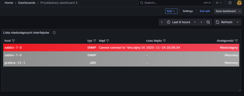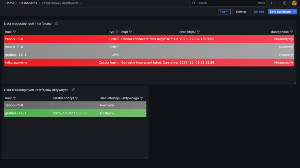Dalej będziemy bazować na stworzonym dashboardzie Przykładowy dashboard 3, na którym aktualnie znajduje się pojedynczy panel z informacjami o niedostępności interfejsów na hostach: