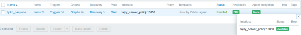 Dlatego tym razem stworzymy listę z niedostępnymi interfejsami aktywnymi dla grupy Linux servers. W tym miejscu zastosujemy również uproszczenie z poprzedniego artykułu – znamy groupid naszej grupy, w naszym przykładzie to 2. By pokazać jak trudny jest to przykład, dodajmy testowo do naszego środowiska nowego hosta tylko_pasywne, który – jak sama nazwa wskazuje – posiada tylko interfejs Zabbix Agent w trybie pasywnym: