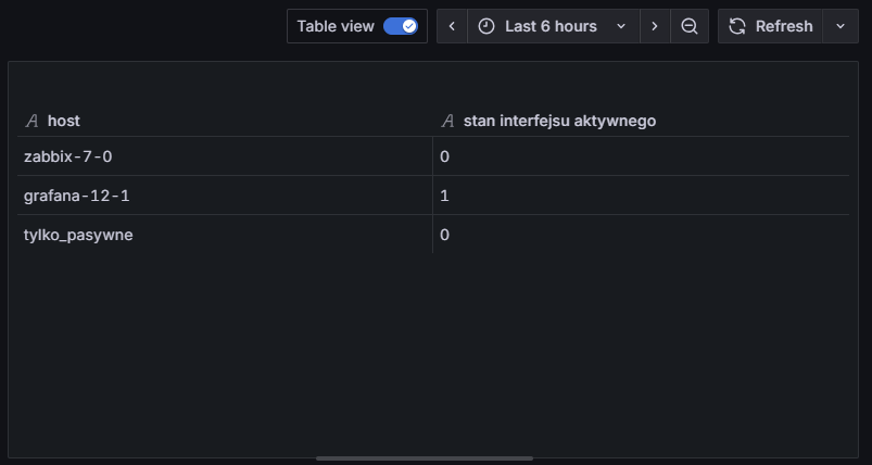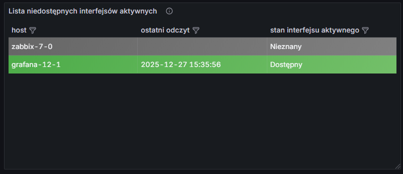 Koniec! Możemy wyjść z konfiguracji panelu (pamiętając o zapisaniu zmian), a na dashboardzie powinna pojawić się gotowa tabela z listą hostów i stanem ich aktywnych interfejsów. Jeśli tabela wydaje się zbyt wąska — warto po prostu poszerzyć kafelek panelu.
