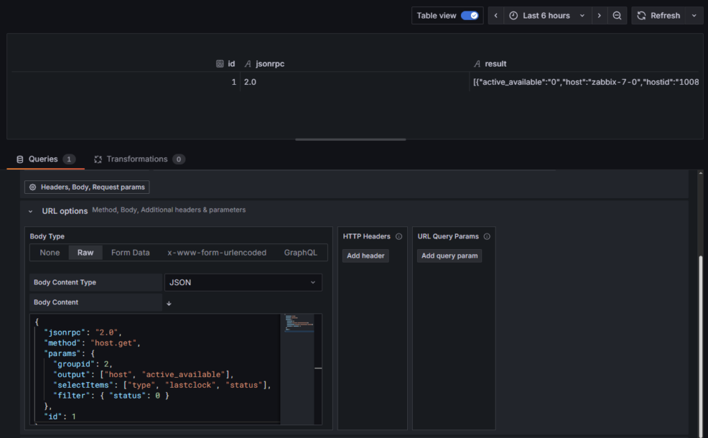 Wystarczy skopiować powyższe zapytanie do sekcji Body panelu w Grafanie i pamiętać o ustawieniu Body Content Type na JSON – reszta konfiguracji pozostaje bez zmian.