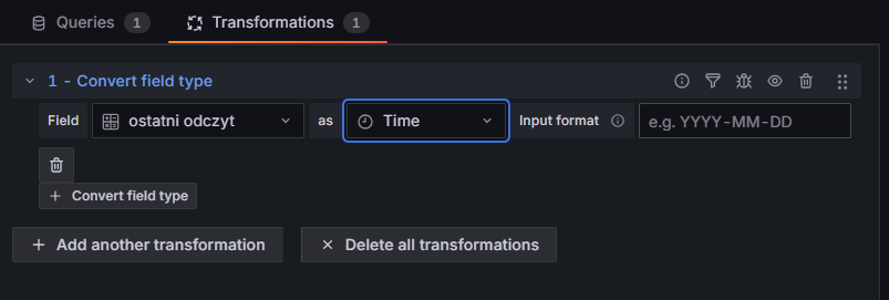 Na tym etapie pozostaje jedynie poprawić czytelność prezentacji danych w Grafanie.W okienku transformat dodajmy jedną o nazwie Convert field type. W jej konfiguracji w polu Field wybierzmy kolumnę ostatni odczyt – dzięki temu Grafana zacznie traktować tę kolumnę jako znacznik czasu i zamiast surowego timestampu wyświetli czytelną datę.