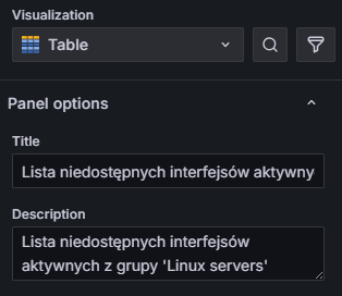 - Ponieważ chcemy prezentować dane w formie tabeli, w sekcji po prawej stronie, w polu Visualization wybieramy Table, dodatkowo dodajemy tytuł np. “Lista niedostępnych interfejsów aktywnych” oraz opis np. “Lista niedostępnych interfejsów aktywnych z grupy ‘Linux servers’”: