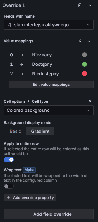 - Aby dane były bardziej zrozumiałe dla osób, które nie znają szczegółów API Zabbixa, skorzystamy ponownie z mechanizmu nadpisań ustawień (opisywanego wcześniej przy parserze UQL). Na tym etapie warto dodać nadpisanie dla kolumny stan interfejsu aktywnego, czyli zamienić wartości liczbowe (0 / 1 / 2) na czytelne etykiety tekstowe (np. nieznany, dostępny, niedostępny) oraz dodać odpowiednie kolory (które zostaną wykorzystane do podkreślenia całego wiersza). Potraktuj to jako krótkie ćwiczenie — Ustawienia te konfigurujemy w taki sam sposób, jak w opisanych wcześniej przykładach z parserem UQL.
